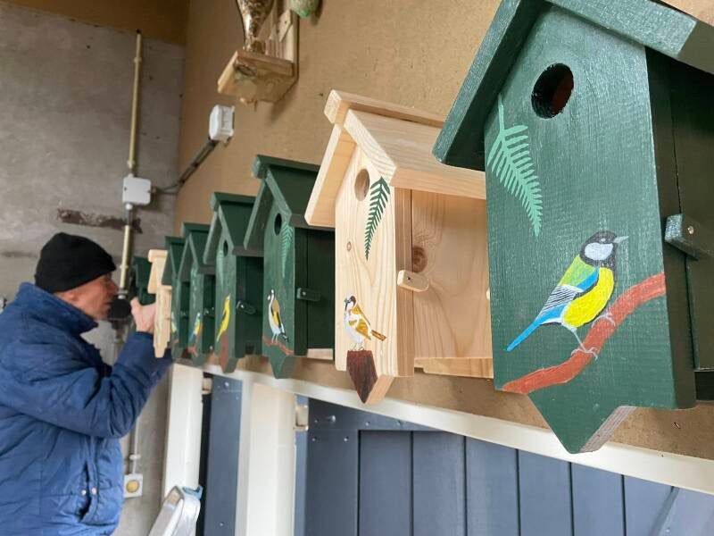 Hij verkoopt al jaren nestkastjes van de Vogelwerkgroep aan de weg in zijn mini-bibliotheek. Toeristen en andere passanten brengen zo toch mooi honderden euro's in het laatje. De gloednieuwe ruimte ziet er schitterend uit. Maar een showroom, durft Gerard het niet te noemen. "Het is gewoon onze schuur", zegt hij bescheiden.