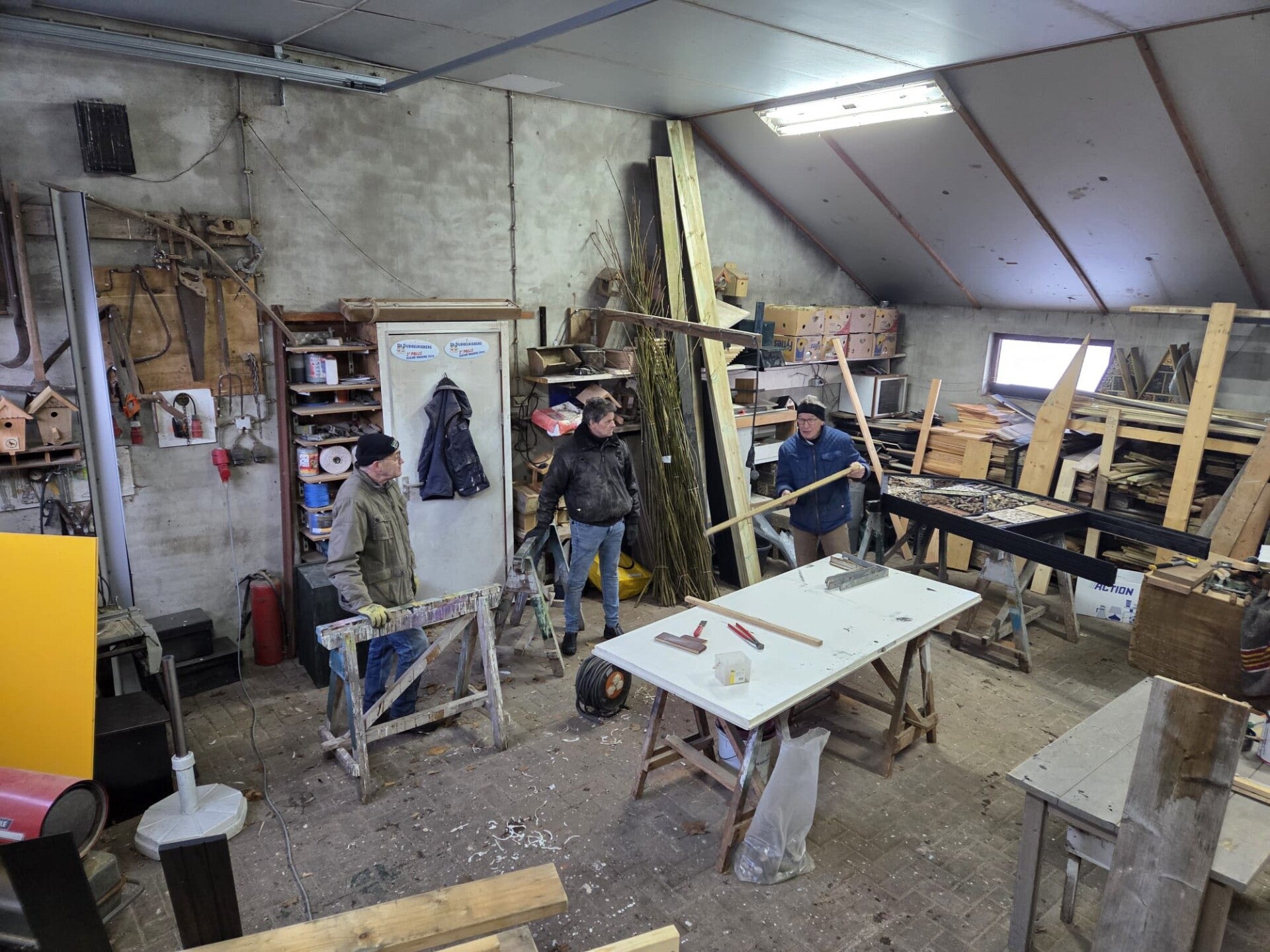 Onze timmerploeg – bekend van de prachtige vogelhuisjes van de Vogelwerkgroep Geesteren – is weer druk bezig met het maken van insectenhotels, voederhuisjes en nestkastjes. Dit gebeurt bij Theo Lohuis in de schuur aan de Langeveenseweg.