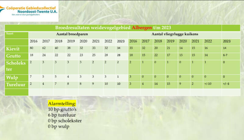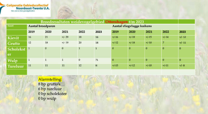De broedresultaten van het weidevogelgebied Ottershagen vielen in 2023 ook wat tegen. Er zit helaas weinig groei in de aantallen broedparen van de kievit en grutto.