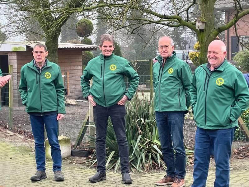 Rechts: Een deel van de timmerploeg van de Vogelwerkgroep Geesteren. Het team is nu op volle sterkte en dat is geweldig. Twee of drie keer per week timmeren zij voor het goede doel: behoud van weidevogels en uilen.