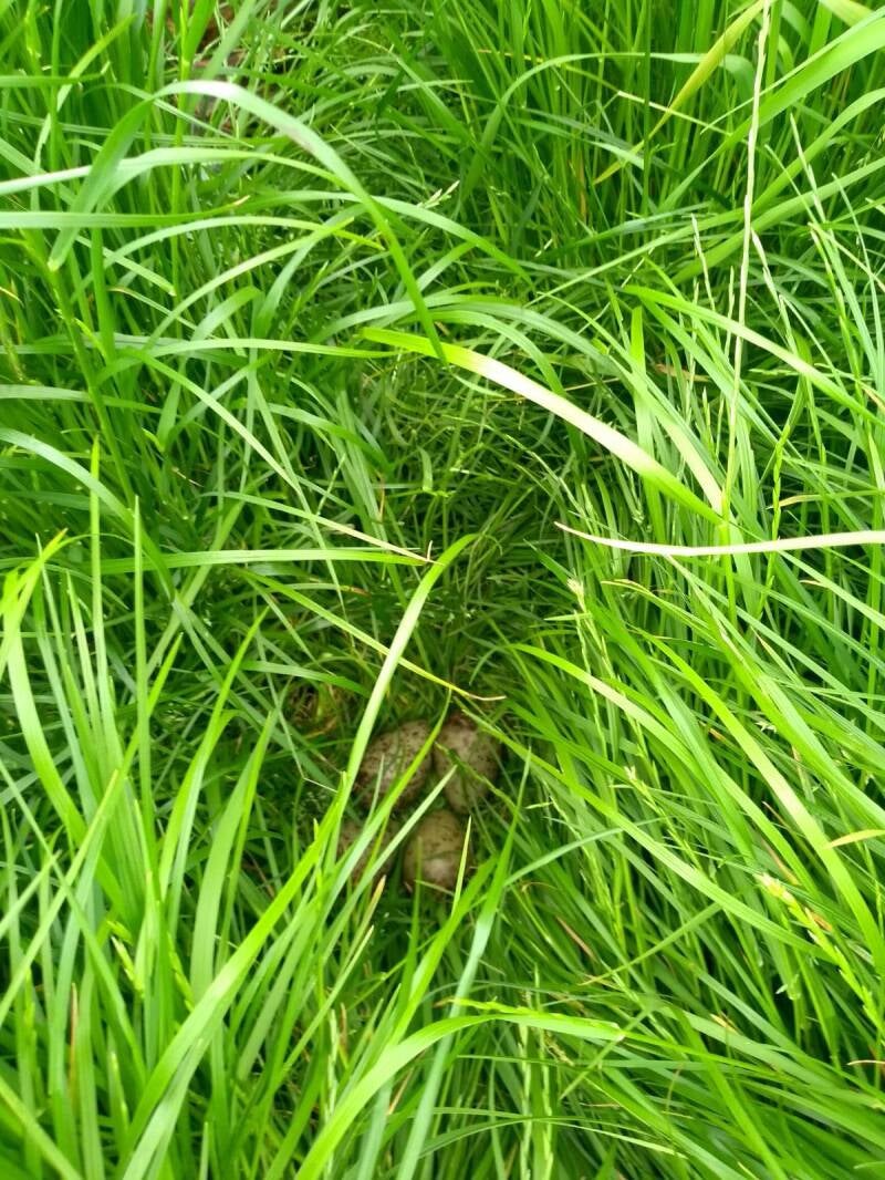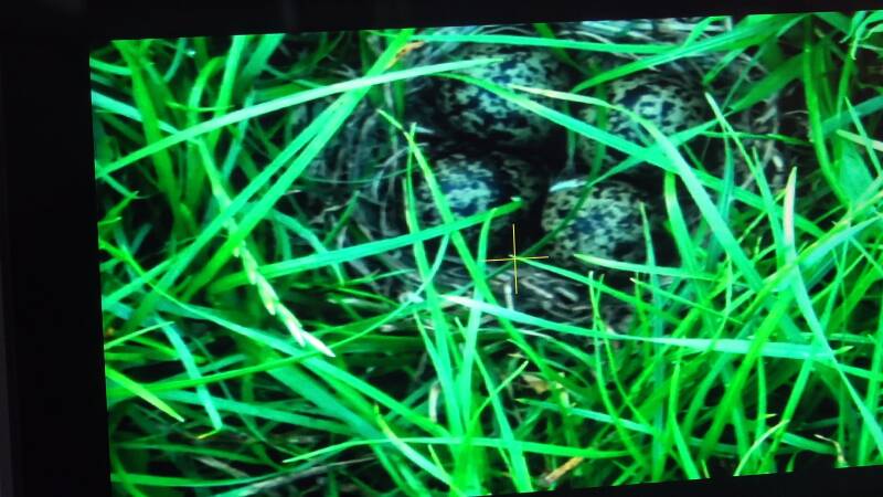 Na een half uurtje en heel veel hazen, die wel weglopen voor de maaier, ziet hij het eerste nestje. Drone naar beneden. Tot op een paar meter. Even goed kijken. Overschakelen op zo'n 2 meter hoogte naar rgb (rood, groen en blauw - de gewone kleurencamera) en we zien vier eitjes met groen gras er om heen. Van een kievit. Geweldig!