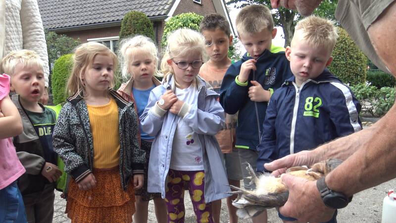 Kinderen van de buitenschoolse opvang De Boerderij bezochten vrijdag 27 juni 2025 het erf van Theo Lohuis want het ringen van kerkuilen stond op het programma. Johan Drop had er dit jaar al 200 geringd in Noord Twente en daar kwamen vanmiddag nog eens twee bij. Het was een goed jaar voor de kerkuil.