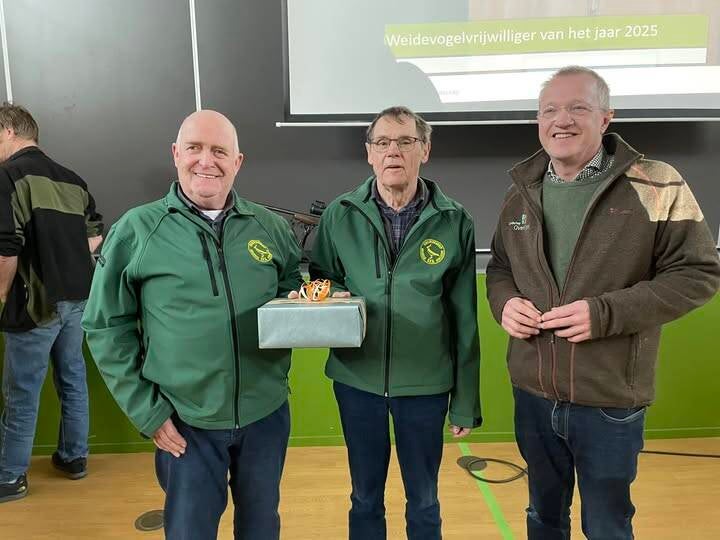 Directeur-bestuurder Michael Sijbom van Landschap Overijssel reikte de trotse vrijwilligersprijs 2025 voor weidevogels uit aan Theo Lohuis en Harry Nobbenhuis (midden). Projectleider Weidevogels, Leonard Rouhof, sprak in zijn toespraak vol lof over beide heren van de Vogelwerkgroep Geesteren. (Zaterdag 8 maart 2025)