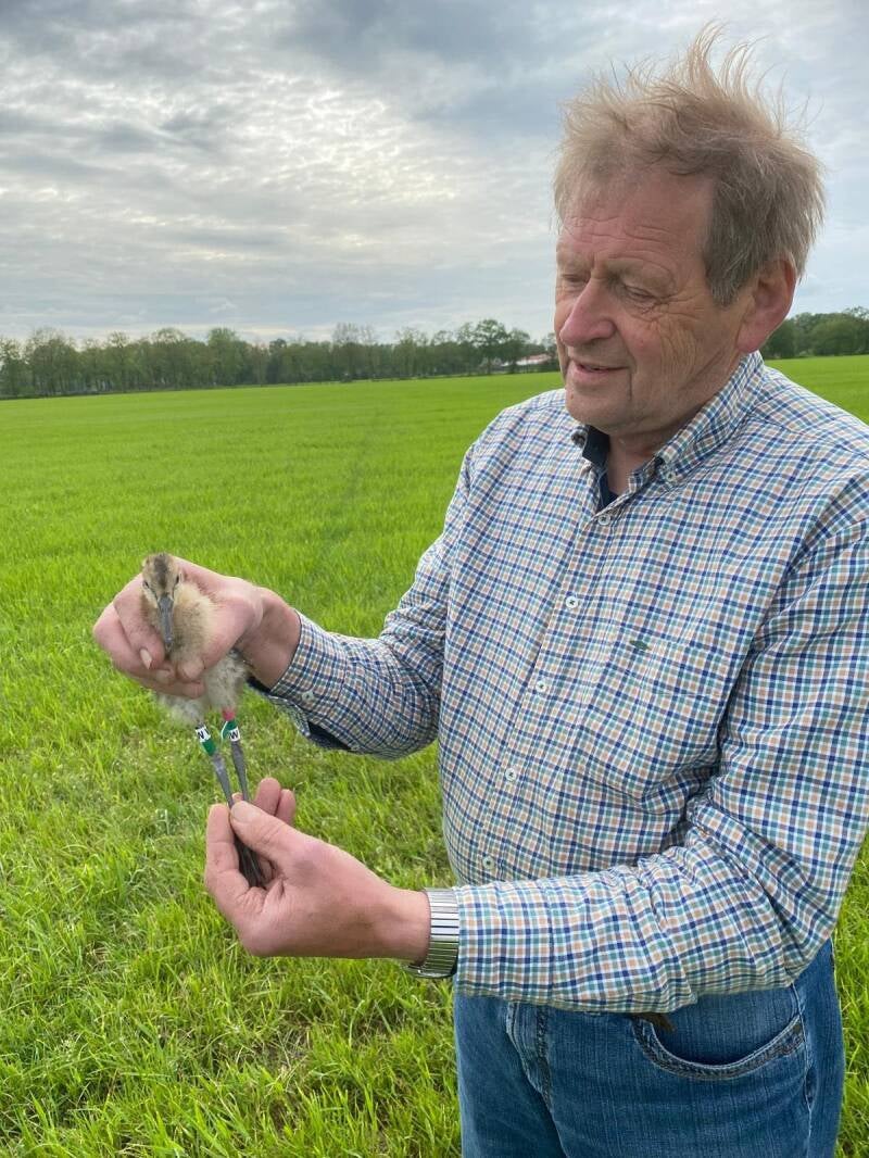 Onze vrijwilliger Niels Stroot heeft vier jonge scholeksters verplaatst van de parkeerplaats bij Plus Droste in Vasse naar een veiliger, hoger gelegen weiland.