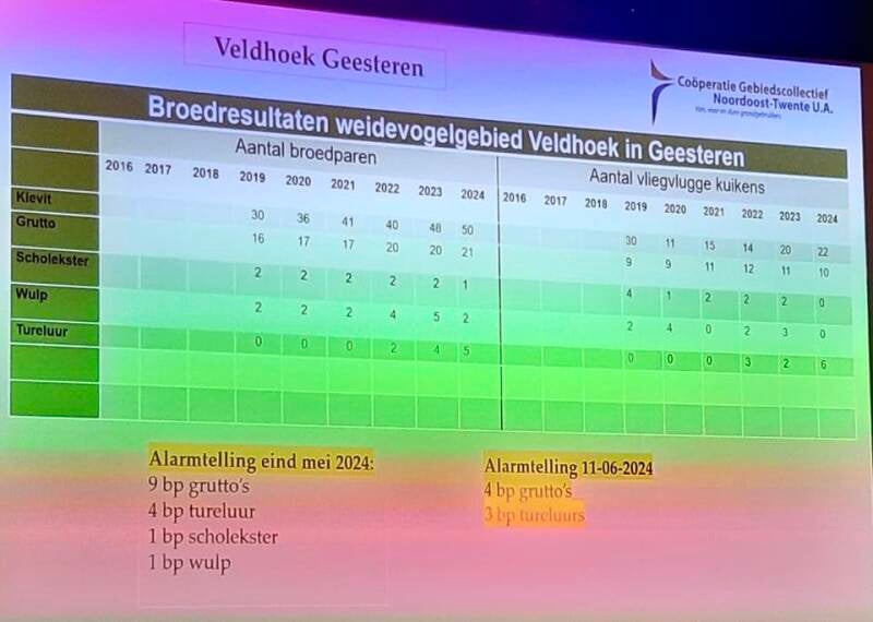 De plasdrassen van Frons, Blokhuis, Haarhuis en Kamphuis in de Veldhoek bij Geesteren kregen alle lof van Rouhof. Veel grutto's en tureluurs komen er voor. Maar ook wulpen en scholeksters. En tegen de landelijke trend in: het aantal kieviten stijgt. Maar ook hier weer: 9 broed paartjes grutto's eind mei 2024 geteld, enkele weken later zijn er nog maar 4 broed paartjes over.