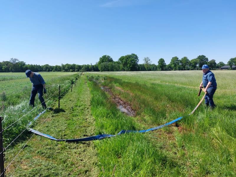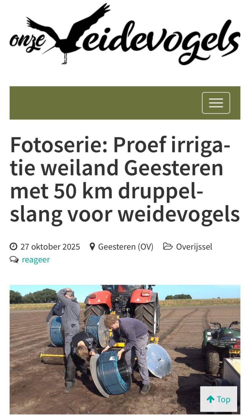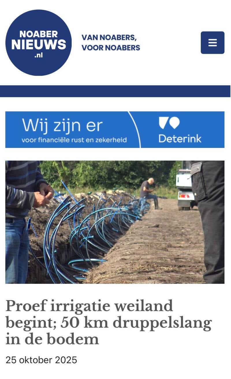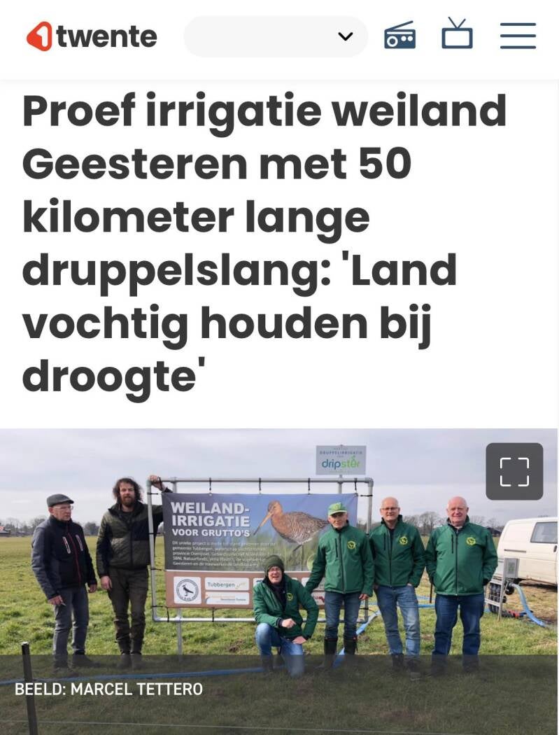 Agrariërs en weidevogels profiteren de komende jaren van een uitgebreide proef met irrigatie van weilanden in Geesteren. Ruim 50 kilometer slangen druppelen vanaf het voorjaar van 2026 glashelder water voor een uitstekende oogst en een ideale biotoop voor weidevogels.