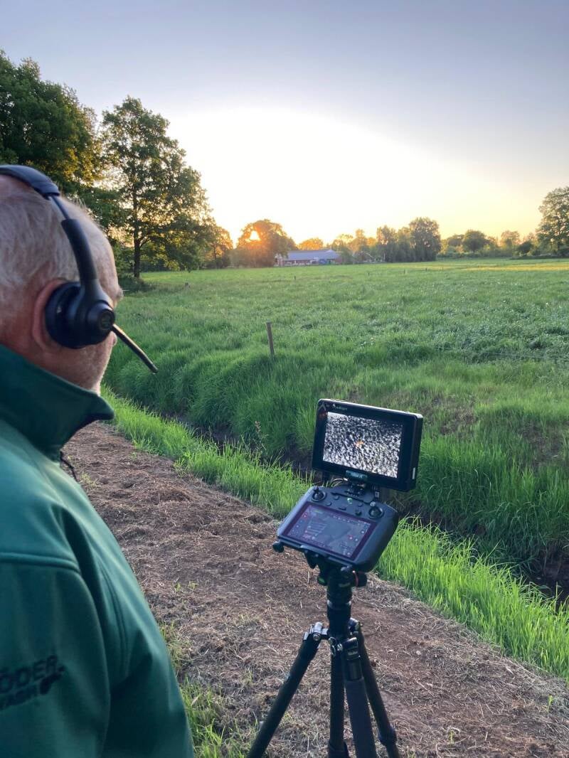 Om 3.45 uur opgestaan want de maaimachine komt. Het leven van een dronepiloot is in deze tijd soms zwaar. Hennie Schröder klaagt niet. Vanaf 8 uur maait een enorme machine een aantal weilanden in De Veldhoek. Dat betekent alle hens aan dek. Een ander team is een paar kilometer verderop actief bij Geesteren.
