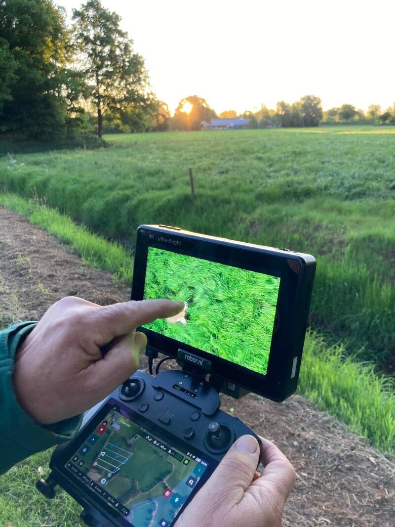 Er zouden nog kuikens in de wei kunnen zitten. Dus scant Hennie drie percelen van in totaal zo'n 50 hectare grootte. De route is al opgeslagen in de afstandsbediening van de drone. Uploaden en vliegen maar. En goed op het beeldscherm letten.