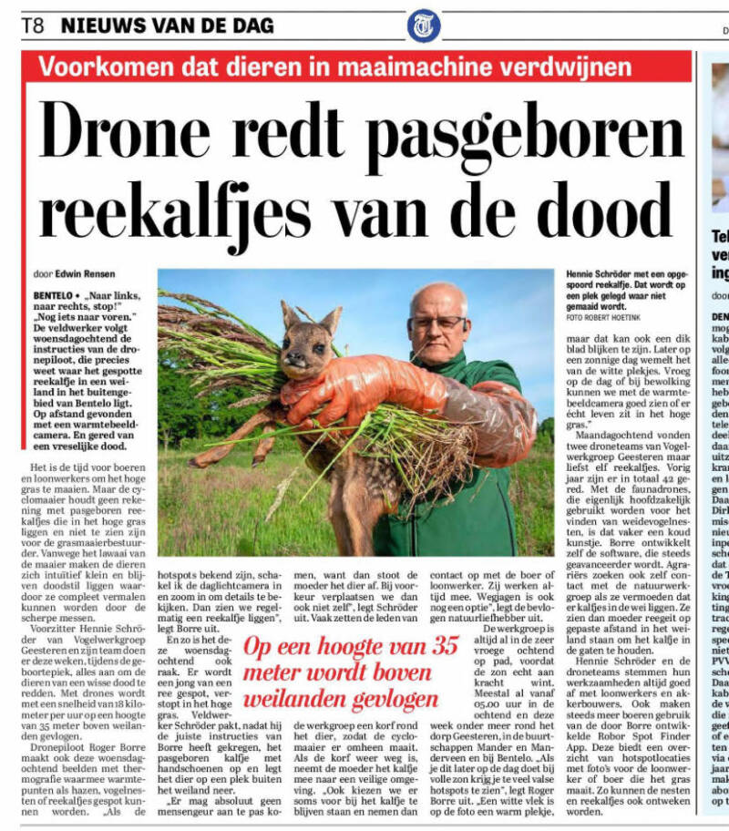 Onze altijd ijverige voorzitter Hennie Schröder zorgde er voor dat de drone doorbrak in de vogelbescherming en ook doorbrak bij het redden van reekalfjes. Wat een fantastisch resultaat. Super, zou Hennie zeggen.