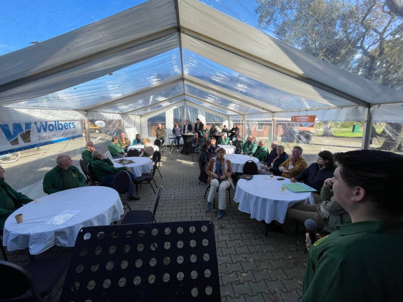Specialist weidevogels, Leonard Rouhof, reikte Theo en Harry een kunstwerkje uit in dorpshuis Lierderholthuis bij Zwolle aan de rand van een weidevogelgebied. De ongeveer 100 bezoekers woonden de opening van het weidevogelseizoen 2025 bij. Landschap Overijssel organiseerde deze startochtend. De weidevogelbescherers brachten daarna een bezoek aan een plasdras in de buurt.