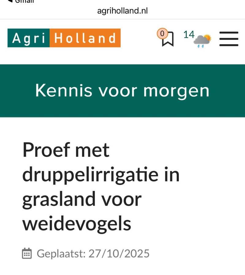 Een waterbron is al geboord en een leiding naar het te irrigeren weiland wordt de komende dagen gelegd. In het najaar volgt pas de druppelleiding zelf. In totaal bijna 70 kilometer slangetjes houden de hele zomer vanaf volgend jaar de bodem nat. Ook al regent het nauwelijks. De dreiging van klimaatverandering zijn dan voorbij. Een prachtig voordeel voor de agrariër en onze weidevogels.