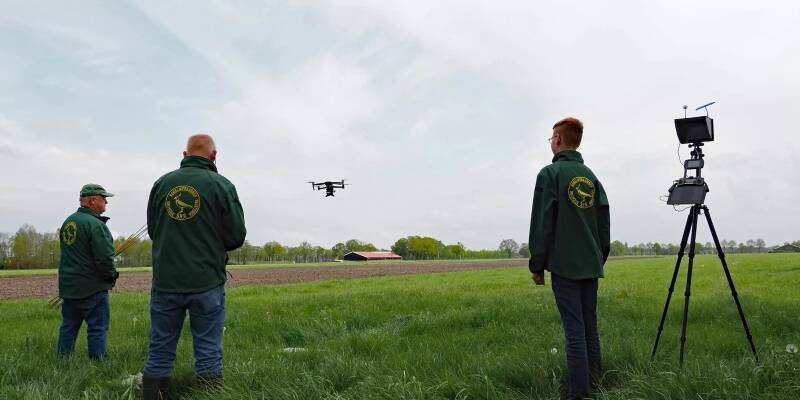 Roger Borre (rechts) demonstreert de drone waarmee de Vogelwerkgroep Geesteren nesten kan vinden van weidevogels. Wat we met 10 man in 1 dag deden doet 1 persoon nu in een half uur. Wat een tijdwinst!