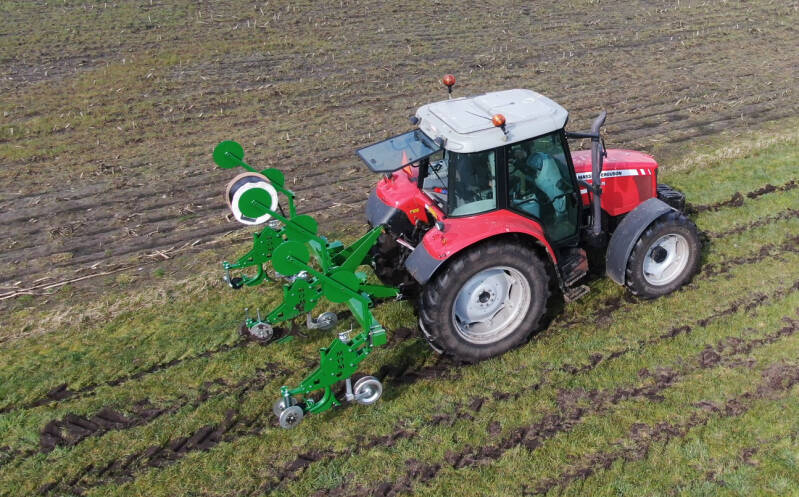 Een trekker met katrollen legt snel slangetjes in de bodem voor het irrigeren van het land. Zonnepanelen zorgen voor stroom om via pompen water in de slangen te krijgen.