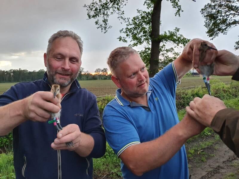 Leonard Rouhof (links) vraagt Theo Lohuis de jonge grutto zo vast te houden dat een goede foto kan worden gemaakt van de ringen om de poten. Hieronder de broers Frons met grutto's.